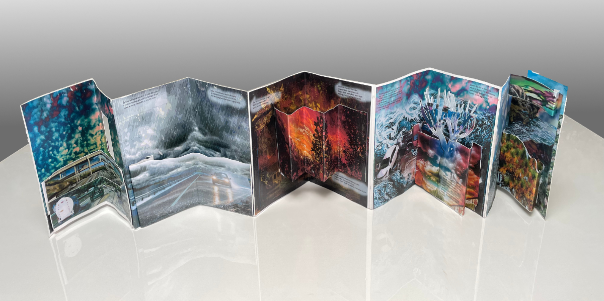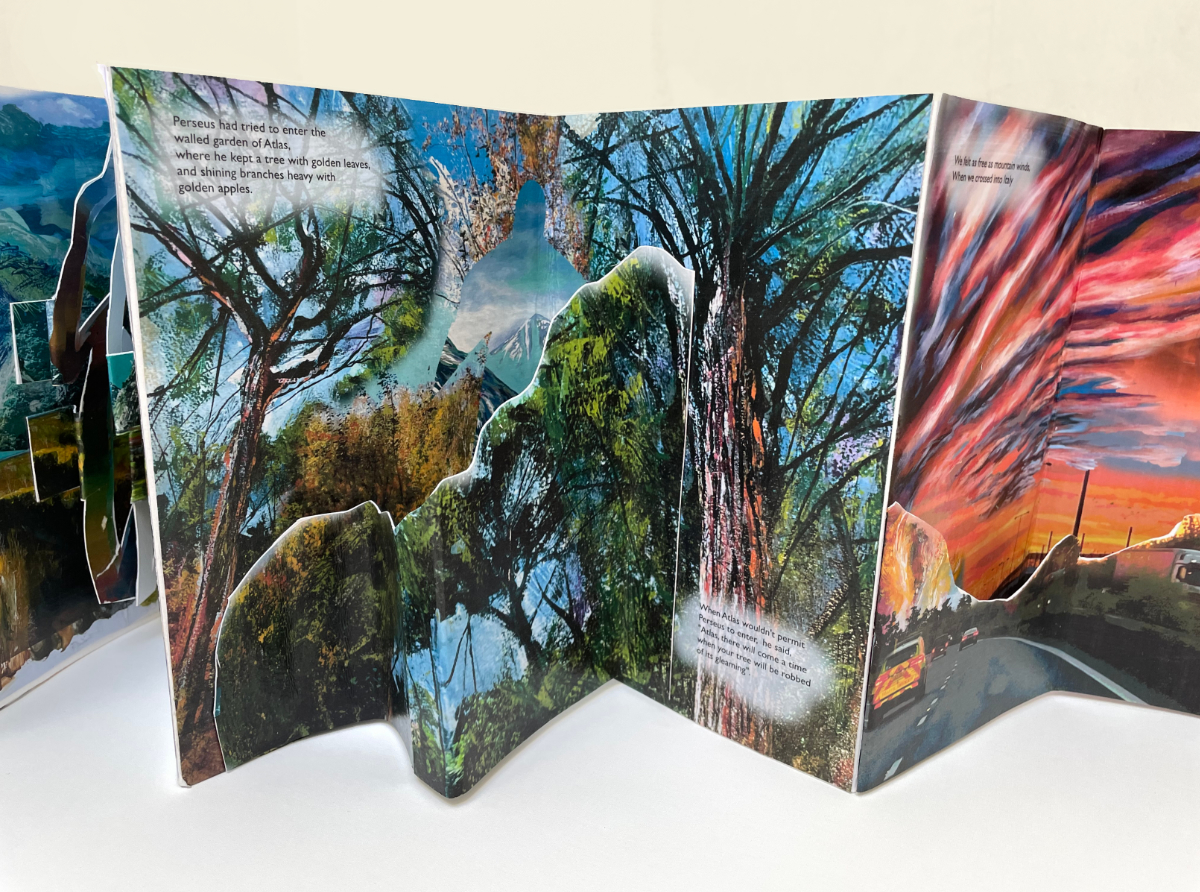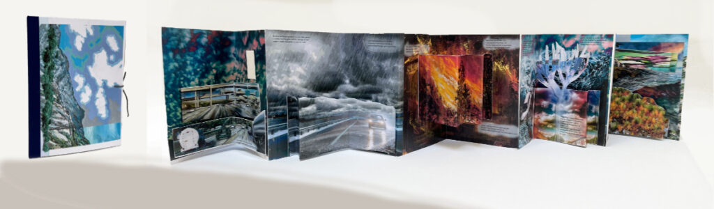 The book is a sculptural leporello of pop-ups on two sides, allowing the viewer to walk around the work,